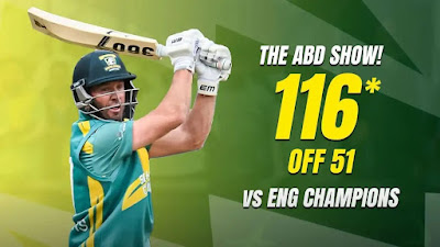 Last night, cricket fans were treated to a vintage masterclass as AB de Villiers rolled back the years with a breathtaking unbeaten 116 runs off just 51 balls against the England Champions. The stage was set, and ABD delivered a spectacle that reminded the world why he’s called Mr. 360 – a legend who can dominate any bowling attack on any given day.